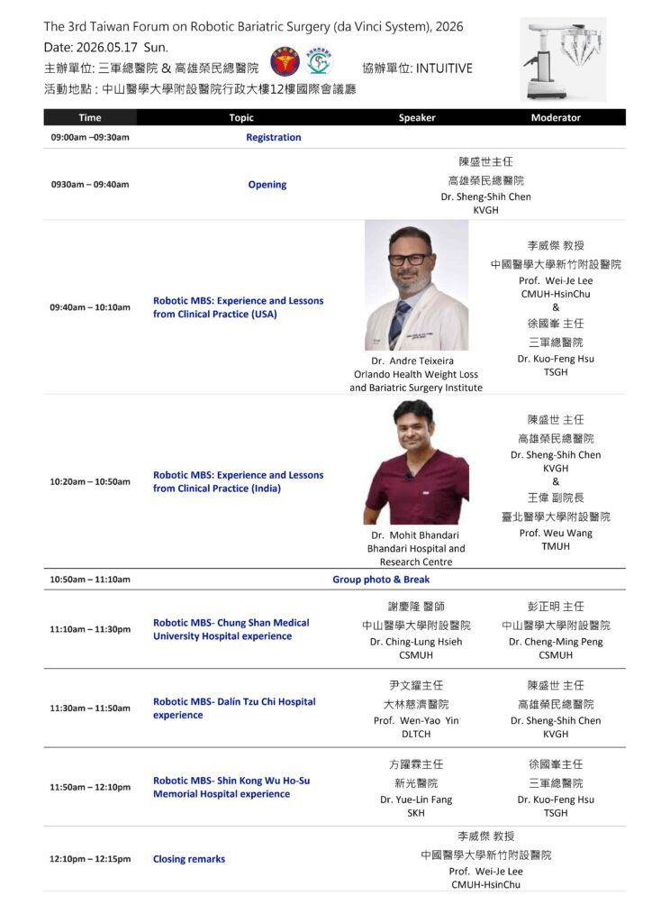 第三屆「達文西機械手臂減重手術論壇」將於 115年5月17日 舉行,邀集國內外專家共同探討機械手臂減重手術之最新發展與臨床應用,誠摯邀請會員踴躍參與。